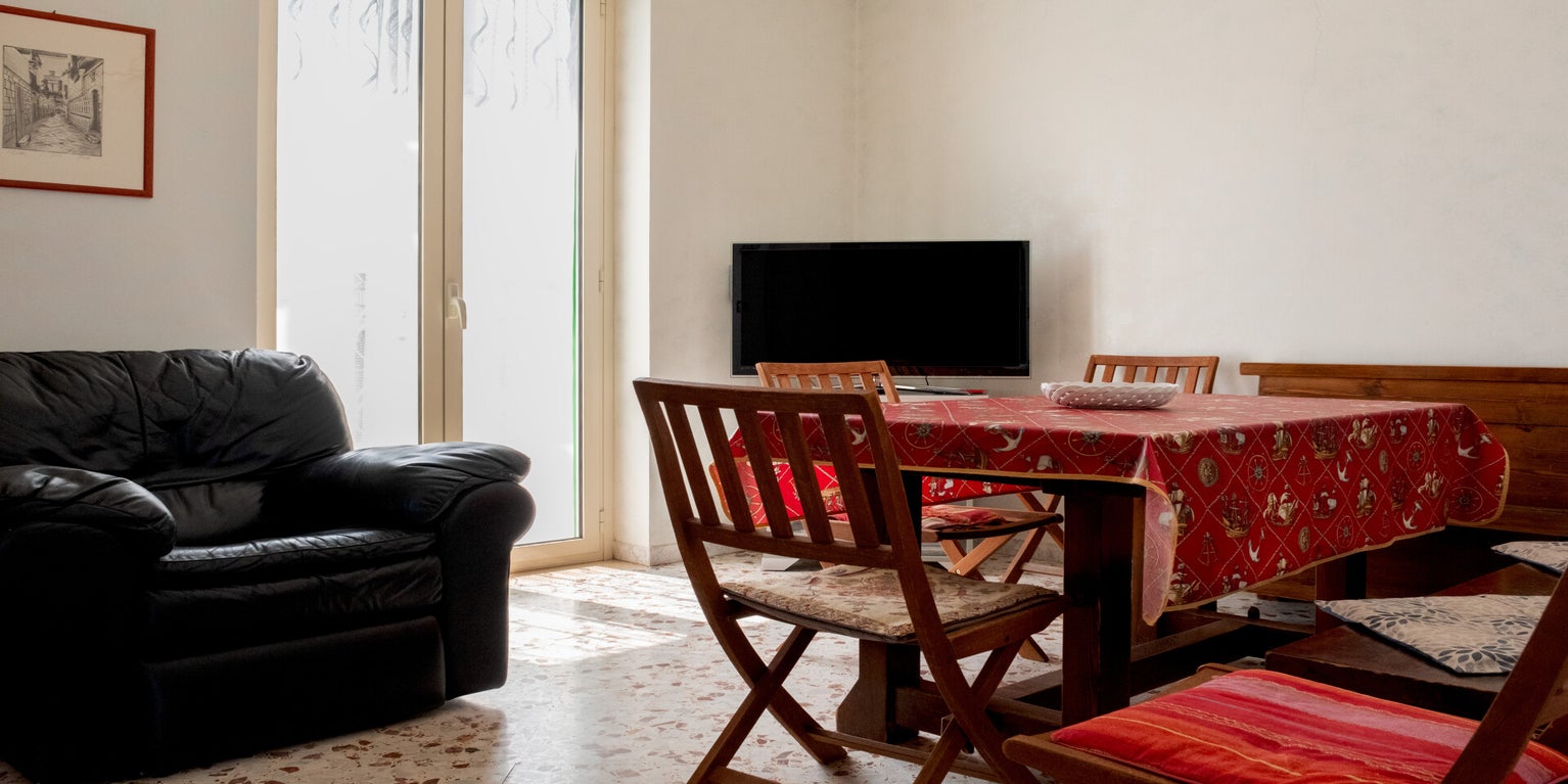 Ampio salone di 30 mq con tavolo e sedie in legno massello dove
